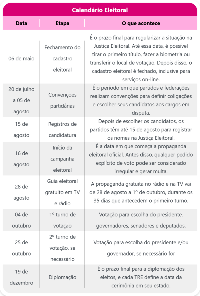 Essas são as datas mais importantes para quem quer acompanhar o processo eleitoral sem complicação. Para facilitar ainda mais, confira as informações na imagem abaixo.